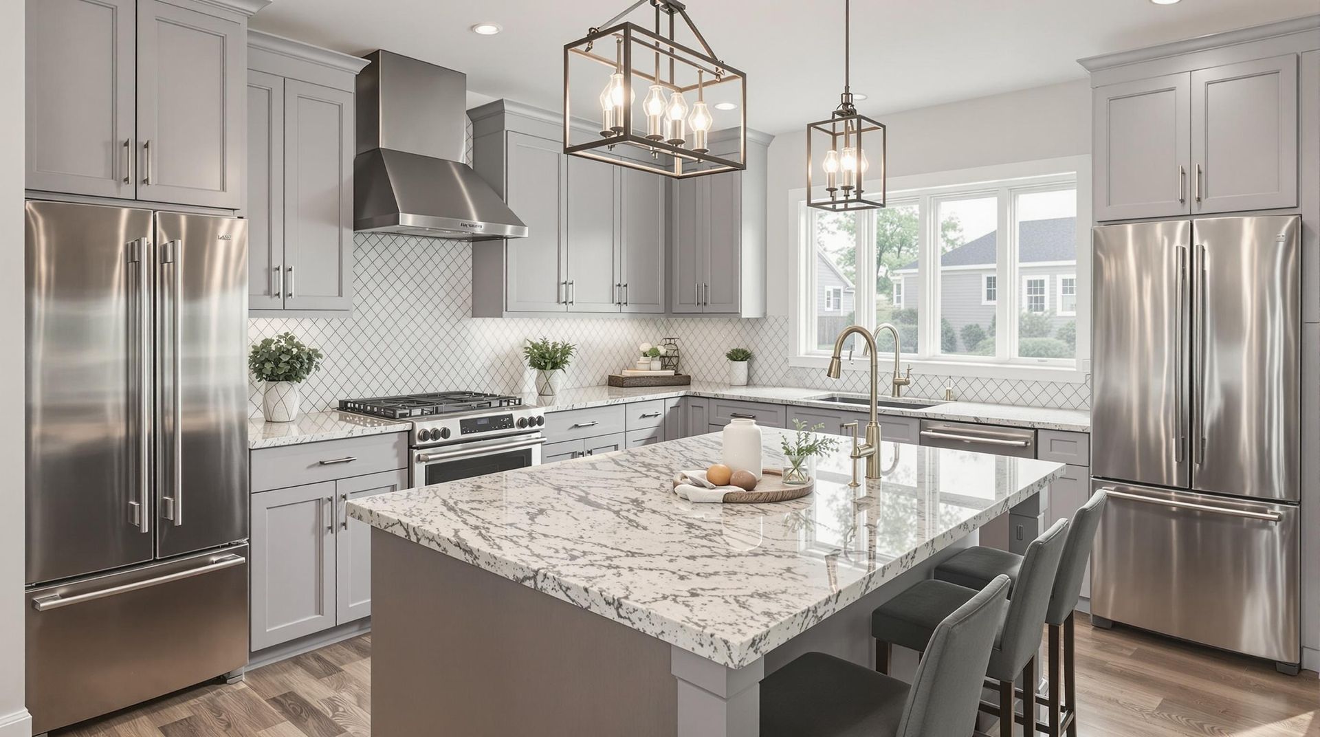 - Mixed materials, like pairing natural wood cabinets with quartz countertops.